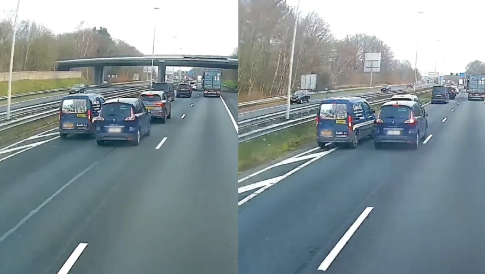In de video is te zien hoe een Renault op de middelste rijstrook rijdt, terwijl de linkerrijstrook langzaam eindigt. De bestuurder links moet invoegen en zoekt een plek. In theorie is dat een eenvoudig en alledaags moment: snelheid aanpassen, oogcontact, ruimte maken, samen verder.