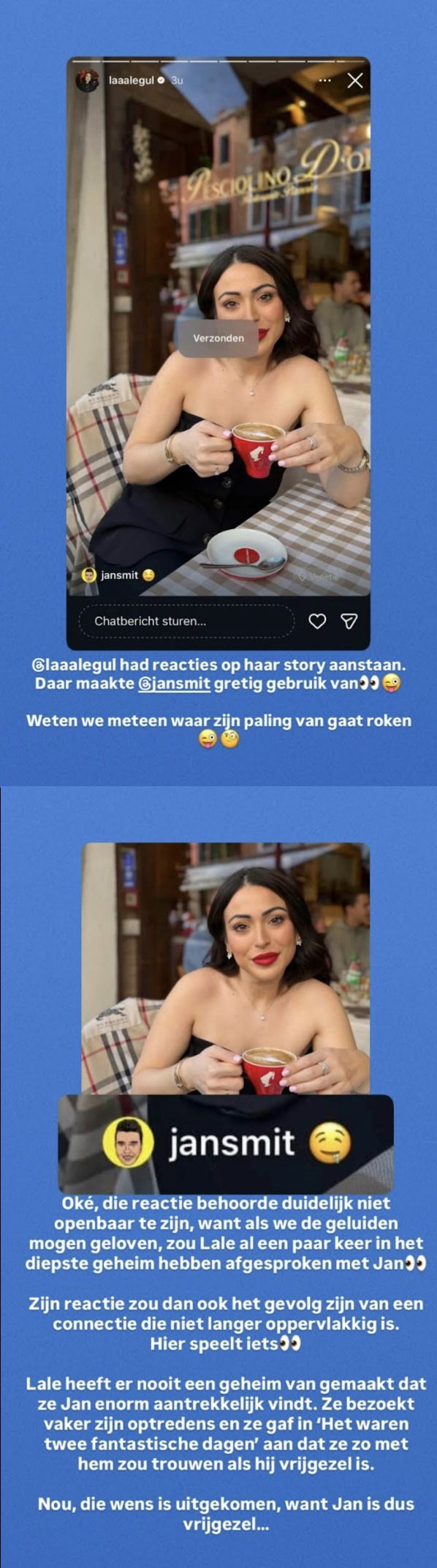 De aanleiding voor de nieuwe geruchten is een reactie die Jan Smit achterliet op een Instagram Story van Lale Gül. Hij reageerde met een emoji die vaak wordt gebruikt om waardering of bewondering uit te drukken.