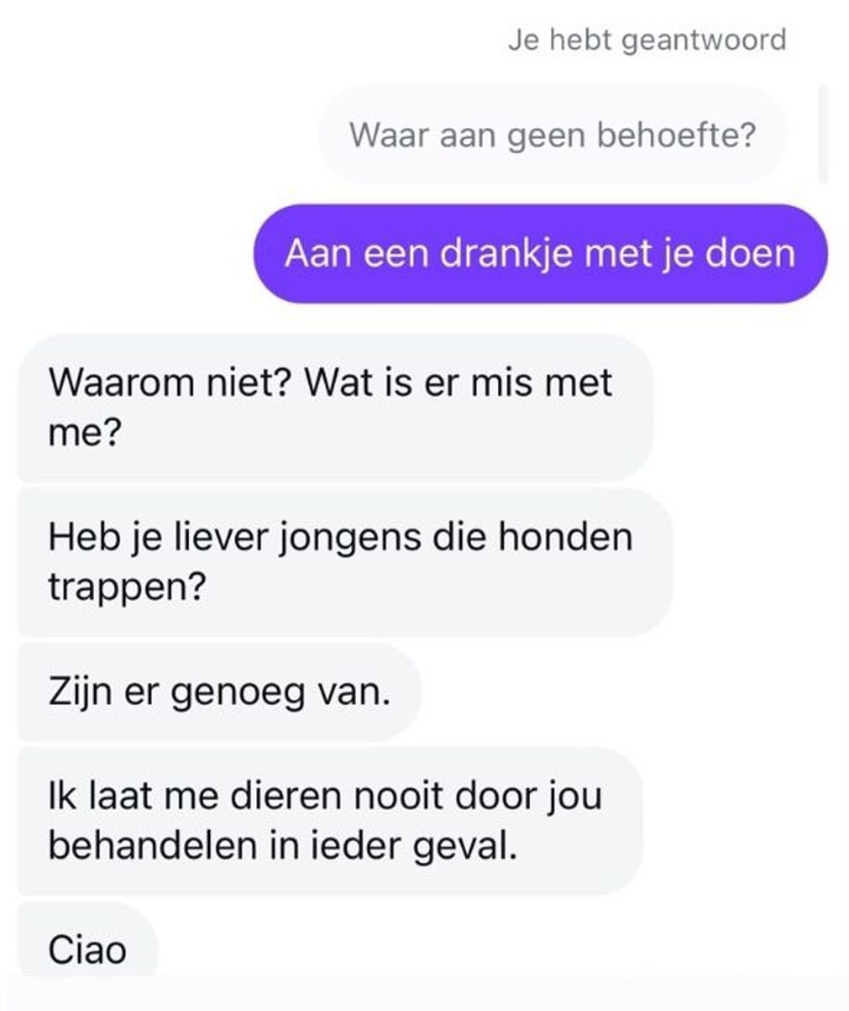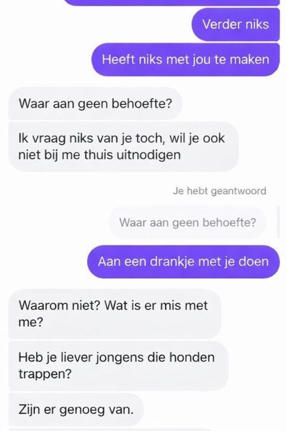 Zijn reactie was overdreven en het gesprek liep al snel uit de hand. De man begon te klagen dat vrouwen tegenwoordig ‘zo moeilijk’ waren en dat het voor hem niet makkelijk was om contact te maken. Hij leek niet te begrijpen dat een eenvoudige afwijzing helemaal niets te maken had met hem persoonlijk, maar eerder met de voorkeur van de vrouw. Dit leidde tot een steeds ongemakkelijker gesprek, waarin hij zijn frustratie bleef uiten, terwijl zij steeds verder afstand nam.