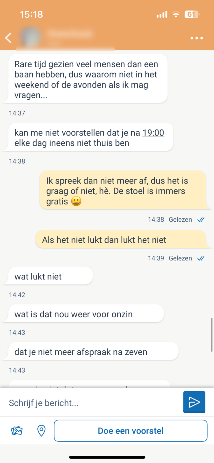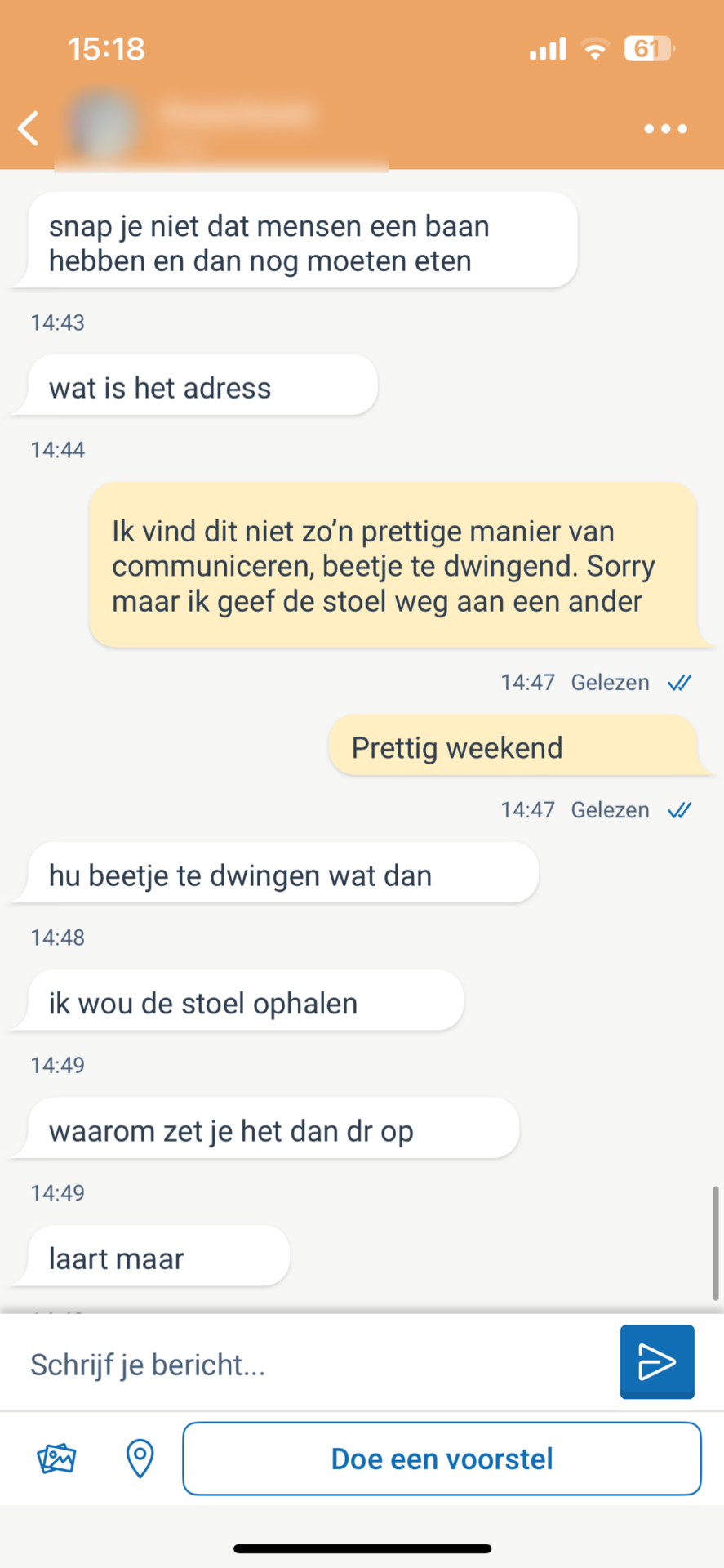 In zijn bericht is de man vrij dwingend en vraagt meteen wanneer hij de stoel kan ophalen. Hij drukt zich niet heel vriendelijk uit, wat de verkoper doet twijfelen.