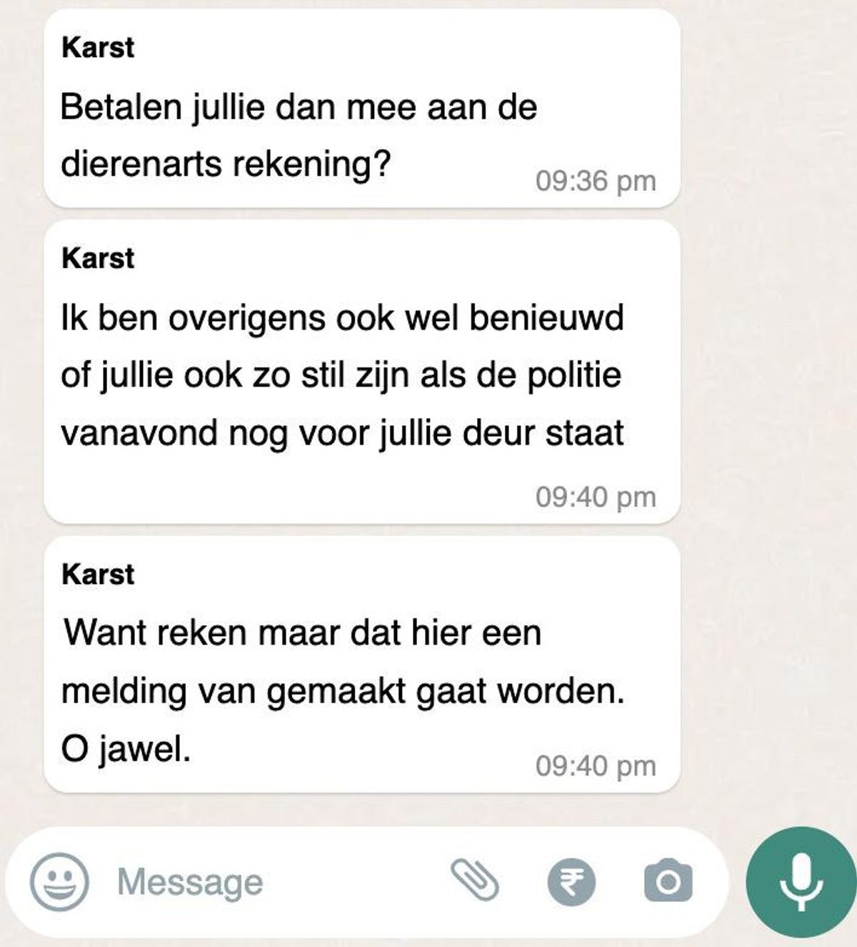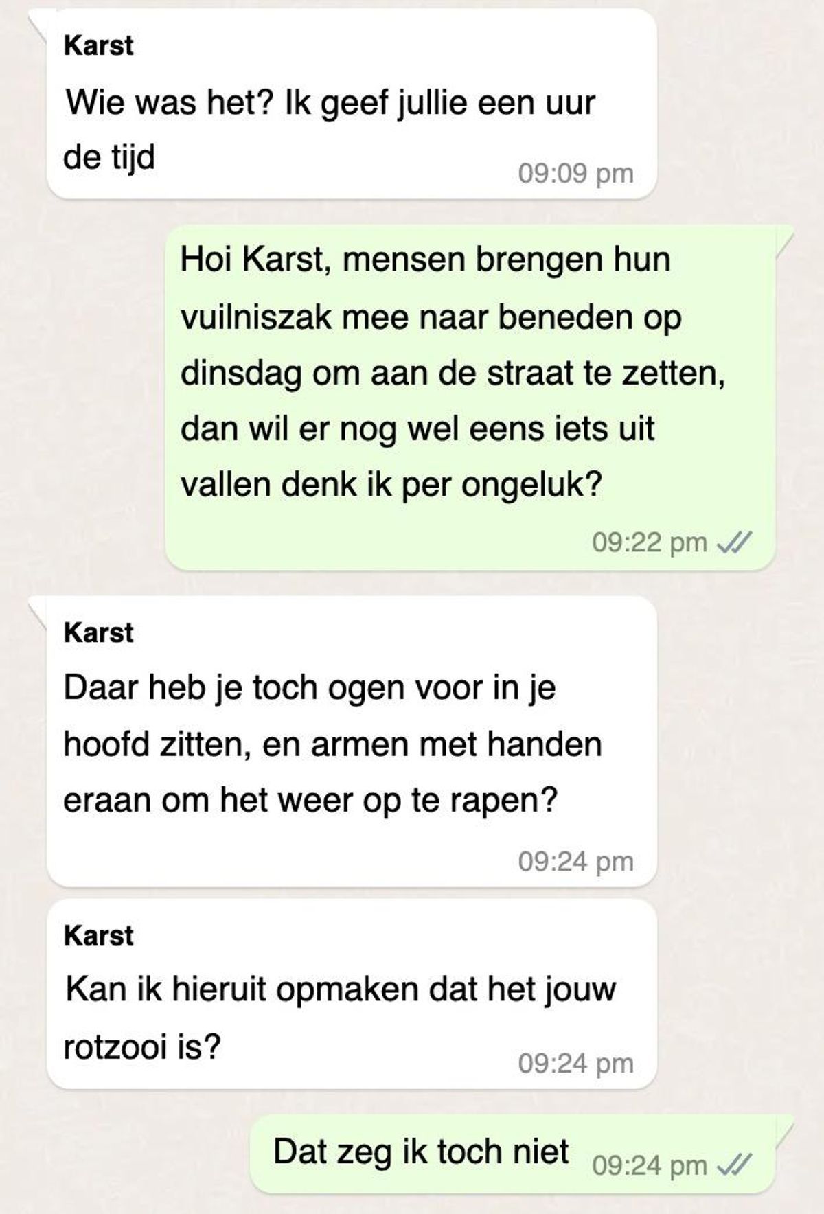 In de berichten beschuldigde ze de klant ervan onterecht te oordelen over haar werkstijl, terwijl zij zelf het gevoel had dat een beetje gesprek juist hielp om de sfeer tijdens het werk te verbeteren. Ze vond dat het niet nodig was om haar zo te wijzen op iets wat zij zelf als onbenullig beschouwde. De situatie liep volledig uit de hand toen de schoonmaakhulp bleef doorgaan met het sturen van berichten, waarin ze haar emoties niet onder controle had.